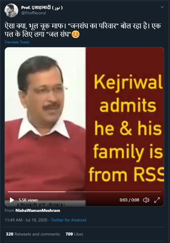 An edited video of Delhi Chief Minister Arvind Kejriwal is viral claiming he admitted to having been associated with the Rashtriya Swayamsevak Sangh (RSS). The clip is being shared with the caption, "Like that, forgive his mistake. "Family of Jana Sangh" is speaking. For a moment it felt like "water association"" (In Hindi - ऐसा क्या, भूल चूक माफ। "जनसंघ का परिवार" बोल रहा है। एक पल के लिए लगा "जल संघ")