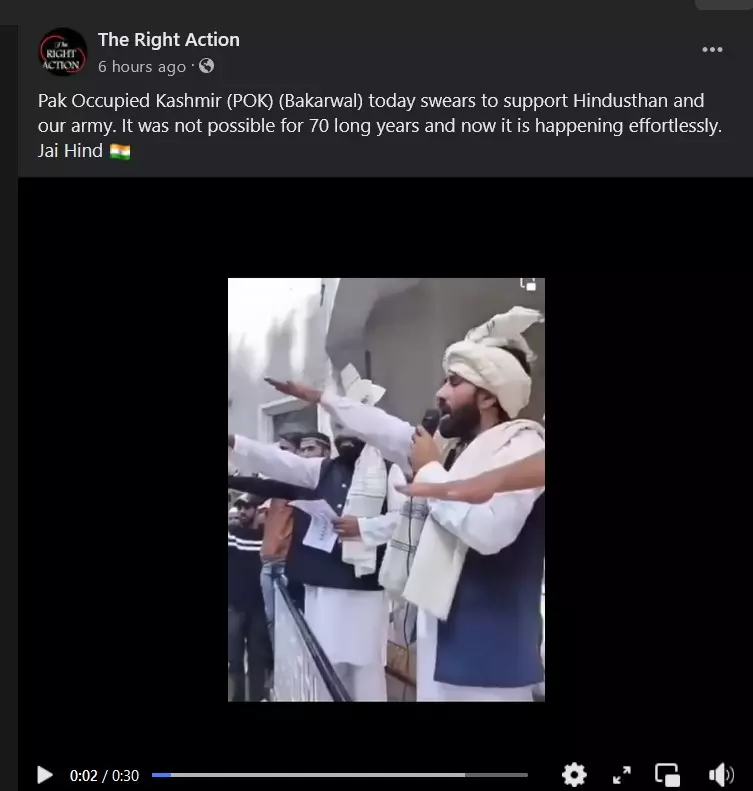 An old video of a group of men chanting slogans in support of the Indian army is being shared to falsely claim that it shows the people of Pakistan Occupied Kashmir (POK) voicing their support to India. The video is being shared with the caption, "Pak Occupied Kashmir (POK) (Bakarwal) today swears to support Hindusthan and our army. It was not possible for 70 long years and now it is happening effortlessly. Jai Hind"