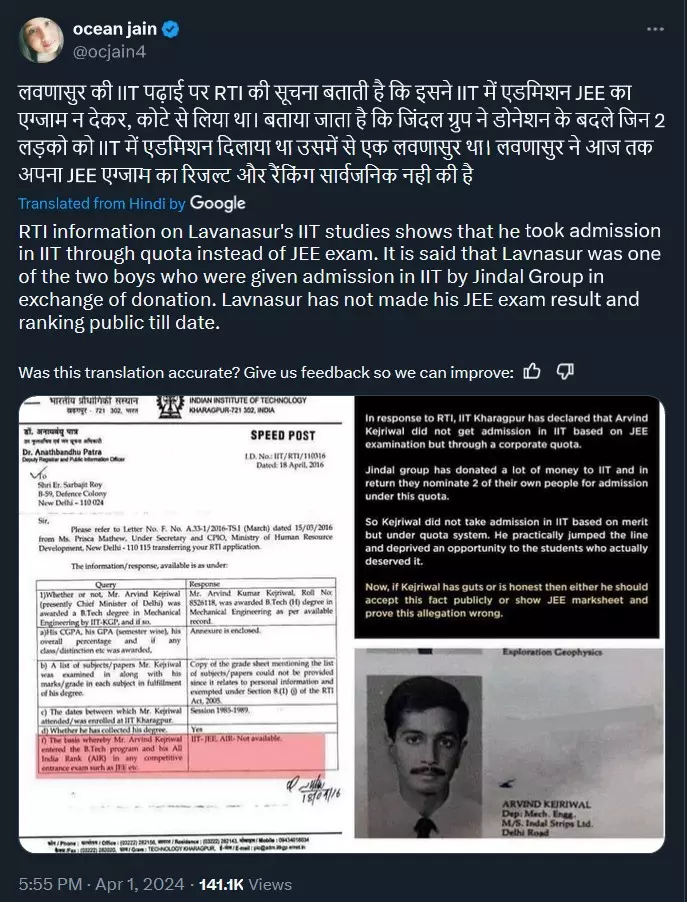Several social media posts are being shared falsely claiming that Delhi Chief Minister Arvind Kejriwal did not clear the competitive Joint Entrance Exam (JEE) for his admission into the Indian Institute of Technology (IIT), and was admitted through corporate quota. The posts are based on a response by IIT Kharagpur to an RTI enquiry dated April 18, 2016, which stated that Kejriwal's all India rank (AIR) was not available. The caption when translated reads, "RTI information on Lavanasur's IIT studies shows that he took admission in IIT through quota instead of JEE exam. It is said that Lavnasur was one of the two boys who were given admission in IIT by Jindal Group in exchange of donation. Lavnasur has not made his JEE exam result and ranking public till date."