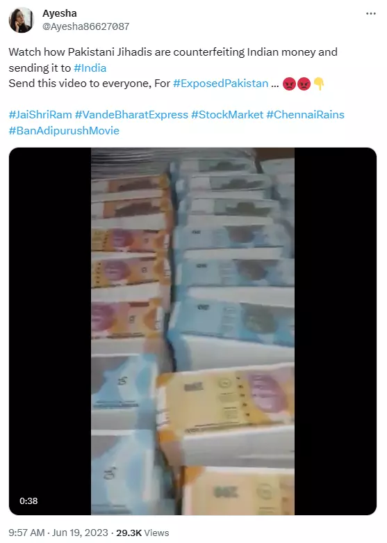 An old video has recently been revived on social platforms with a claim that it shows a recent visual of Pakistanis counterfeiting Indian currencies. In the video, a person can be spotted with bundles of denominations of rupees 50 and 200 notes surrounded by some printing machines. The video is being shared with a caption, "Watch how Pakistani Jihadis are counterfeiting Indian money and sending it to India. Send this video to everyone, For Exposed Pakistan…"