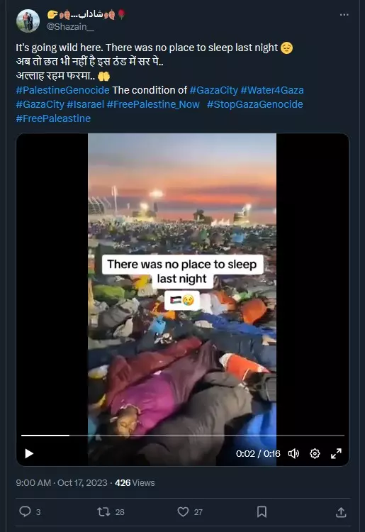 A video of pilgrims sleeping out in the open during a Catholic festival that was held in Lisbon, Portugal in August 2023 is being shared falsely linking it to the recent Hamas - Israel conflict. The video is being shared with the caption, "It's going wild here. There was no place to sleep last night अब तो छत भी नहीं है इस ठंड में सर पे.. अल्लाह रहम फरमा.. #PalestineGenocide The condition of #GazaCity"