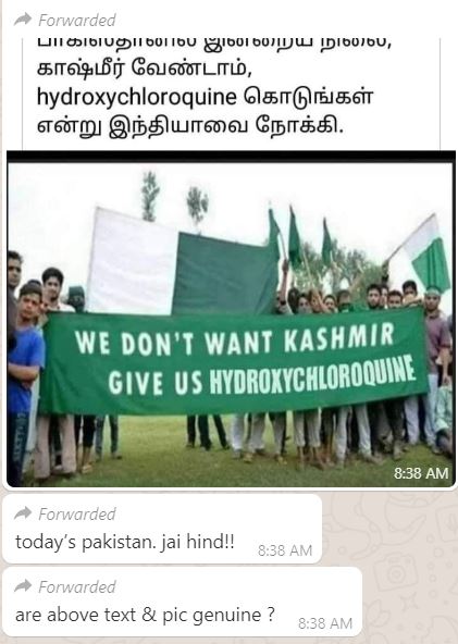 An image of Kashmiri protestors holding Pakistan flags and demanding 'Azaadi' has now been photoshopped to falsely claim that Pakistani citizens are asking for anti-malarial drug hydroxychloroquine from India in lieu of Kashmir. This is being shared in the backdrop of reports stating that India would be sending the drug to other countries to help tackle the Coronavirus outbreak. BOOM found that the original image is from a 2016 India Today article that shows protestors in Kashmir displaying Pakistan flag and banners demanding 'freedom'. The banner in the original picture reads, "We Want Azadi". BOOM had previously fact-checked the same image in June 2019, when it was earlier edited to falsely claiming that Pakistani cricket fans want Virat Kohli instead of Kashmir.
