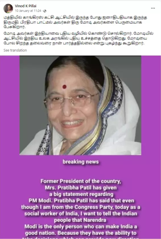 A fake quote praising Prime Minister Narendra Modi and misattributed to former President of India Pratibha Patil has resurfaced on social media. The quote is circulating on Facebook as a real comment by Pratibha Patil. An excerpt from the quote reads, "Even though I am from the Congress Party, today as a social worker of India, I want to tell the Indian people that Narendra Modi is the only person who can make India a good nation. Because they have the ability to take decisions which can provide new direction to the citizens of India. Modi ji has given a new direction to the country of India, I have also served as a President for the country. But I have never seen a leader like PM Modi.” BOOM also received the post on its helpline number 7700906588 for verification.