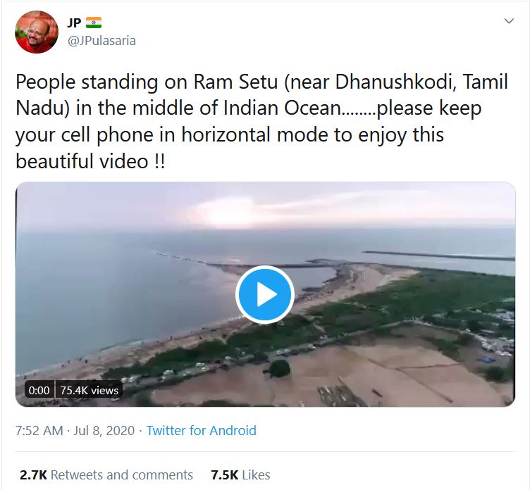 A video showing people walking on a strip of land with the sea on either sides is viral on social media with many claiming it is the Ram Setu, a bridge which is said to have been built by Hindu deity Ram to go to Lanka and fight another deity Ravana. "People standing on Ram Setu (near Dhanushkodi, Tamil Nadu) in the middle of Indian Ocean........please keep your cell phone in horizontal mode to enjoy this beautiful video !!" The post claims that the video shows the Ram Setu in the Indian Ocean near Dhanushkodi, Tamil Nadu.