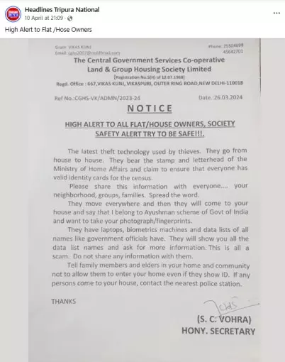 An internal ciruclar issued by the managing committee of a residential complex in Delhi asking residents to be wary of a gang of thieves posing as government officials is falsely viral as an order issued by the police for all housing societies in the country. The circular on a letterhead, "Central Government Service Cooperative Land and Group Housing Society" warns people not to let any stranger in their house as thieves are entering houses under the guise of Ministry of Home Affairs employees conducting a survey for the 'Ayushman' scheme.