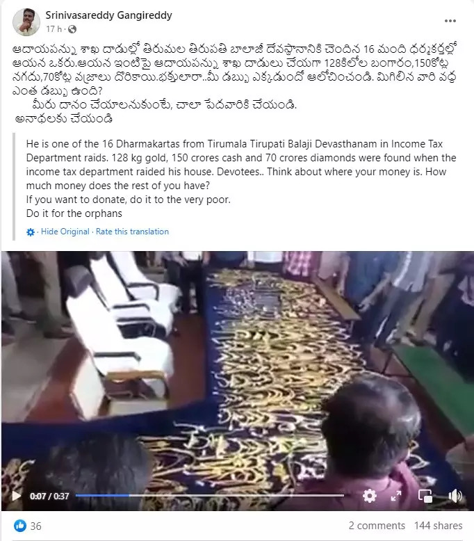 A video of stolen jewellery and gold recovered by Tamil Nadu police is being shared with a false claim that it shows valuables recovered during an income tax raid on Tirumala Tirupati Devasthanam (TTD) board member's house. The Facebook posts are captioned in Telugu as, “He is one of the 16 Dharmakartas from Tirumala Tirupati Balaji Devasthanam in Income Tax Department raids. 128 kg gold, 150 crores cash and 70 crores diamonds were found when the income tax department raided his house. Devotees.. Think about where your money is. How much money does the rest of you have? If you want to donate, do it to the very poor. Do it for the orphans”. (Original text in Telugu: “ఆదాయపన్ను శాఖ దాడుల్లో తిరుమల తిరుపతి బాలాజీ దేవస్థానానికి చెందిన 16 మంది ధర్మకర్తల్లో ఆయన ఒకరు.ఆయన ఇంటిపై ఆదాయపన్ను శాఖ దాడులు చేయగా 128కిలోల బంగారం,150కోట్ల నగదు,70కోట్ల వజ్రాలు దొరికాయి.భక్తులారా..మీ డబ్బు ఎక్కడుందో ఆలోచించండి. మిగిలిన వారి వద్ద ఎంత డబ్బు ఉంది? మీరు దానం చేయాలనుకుంటే, చాలా పేదవారికి చేయండి. అనాథలకు చేయండి.”)
