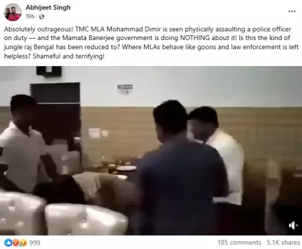 A video showing a man attacking a police personnel has resurfaced with a false claim that it shows Trinamool Congress MLA Mohammad Dimir assaulting an on-duty officer in West Bengal. The claim has been debunked multiple times by BOOM, as we found that the video has no connection to West Bengal. Social media users have recently shared the video with the caption, "Absolutely outrageous! TMC MLA Mohammad Dimir is seen physically assaulting a police officer on duty — and the Mamata Banerjee government is doing NOTHING about it! Is this the kind of jungle raj Bengal has been reduced to? Where MLAs behave like goons and law enforcement is left helpless? Shameful and terrifying!". One such post can be seen here.