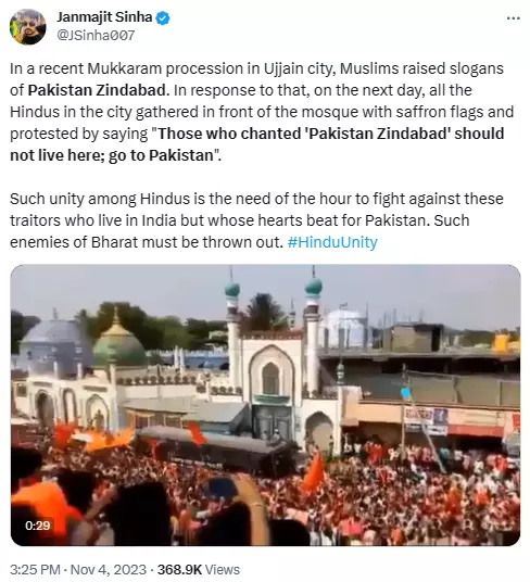 A video of a large procession in front of a mosque has recently been revived with a false claim that it shows a recent protest by Hindus in Ujjain, Madhya Pradesh, against Muslims who allegedly chanted 'Pakistan Zindabad' during a Muharram procession. The claim further states that the Hindus have urged Muslims who voiced support for Pakistan to relocate to Pakistan. The clip is being shared with a caption that states, "In a recent Mukkaram procession in Ujjain city, Muslims raised slogans of Pakistan Zindabad. In response to that, on the next day, all the Hindus in the city gathered in front of the mosque with saffron flags and protested by saying "Those who chanted 'Pakistan Zindabad' should not live here; go to Pakistan". Such unity among Hindus is the need of the hour to fight against these traitors who live in India but whose hearts beat for Pakistan. Such enemies of Bharat must be thrown out."