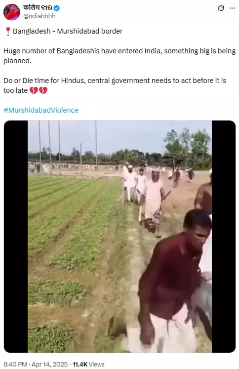 A video showing a large number of people carrying sticks, walking and vandalising things coming on their way has now been revived amid communal tensions in West Bengal with a false claim that it shows recent visuals of Bangladeshis entering India via the Murshidabad border. The video is being circulated online with the caption, "Bangladesh - Murshidabad border. Huge number of Bangladeshis have entered India, something big is being planned. Do or Die time for Hindus, central government needs to act before it is too late". Click here to view an archive of the post.