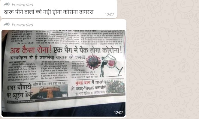 The clipping is viral with the caption "People who consume alcohol will not be affected by Coronavirus" (Translated from "दारू पीने वालों को नही होगा कोरोना वायरस")