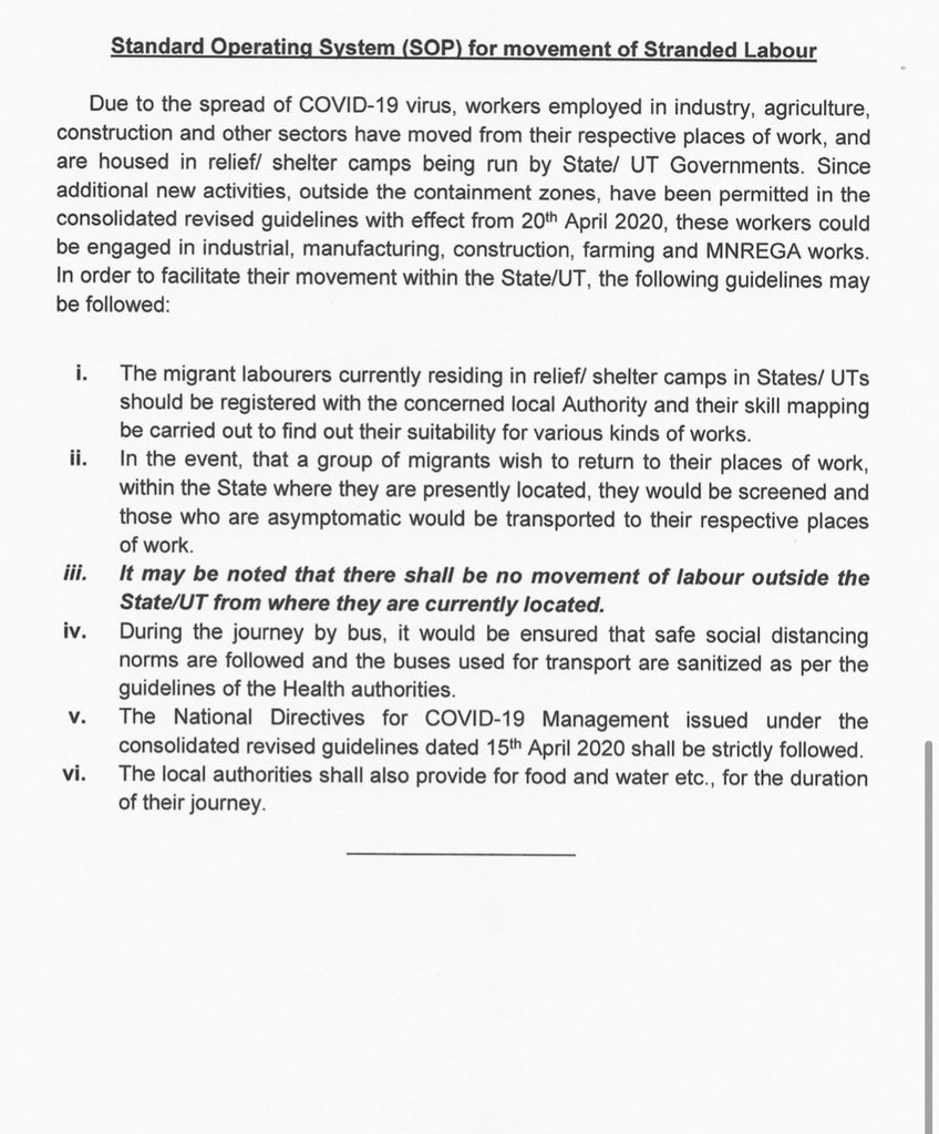 The Home Ministry on April 19, 2020, allowed the movement of migrant labour within a state in buses and issued standard operating procedure for the same, however inter-state movement has not been allowed.