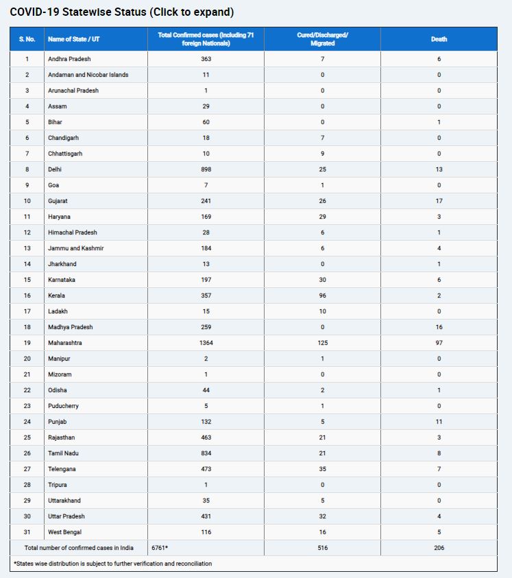 The Ministry of Health and Family Welfare reported a total of 6761 positive cases in the country on April 10, 2020. 37 deaths and 896 new COVID-19 cases were reported in the last 24 hours.