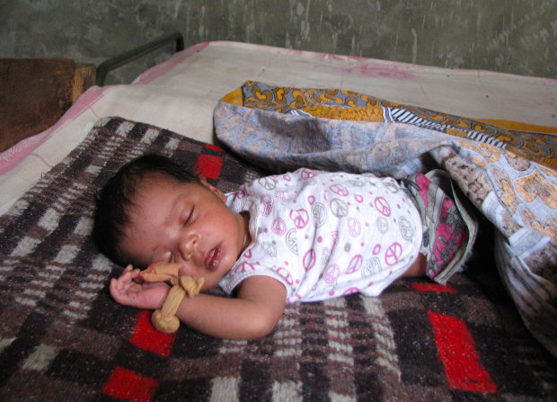 It’s a substantial but sparse two-room house, and flies infest the courtyard, buzzing ceaselessly around Manseerat Gill, 14 days old. Undisturbed by their buzzing, she sleeps peacefully.