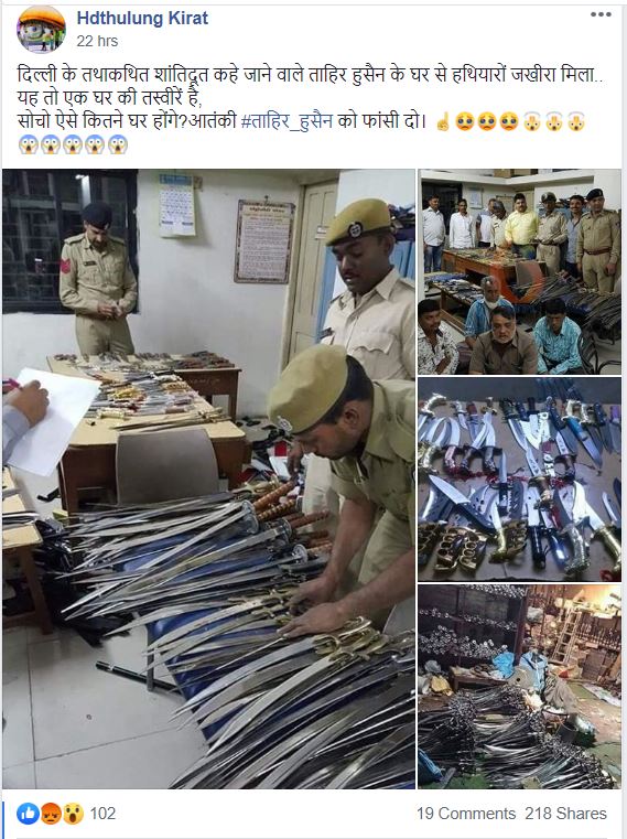 The images are from 2016 when Gujarat police busted an illegal weapons racket operating out of a hotel and not from suspended Aam Aadmi Party councilor Tahir Hussain's house in North East Delhi. The last photograph of guns lying on the ground is from a ‘kirpan’ factory in Patiala, Punjab according to an India Toady article. The same set of images were earlier viral with the false claim that weapons were seized from a mosque in Gujarat and mosques in Jammu And Kashmir. BOOM had earlier debunked these image on July 24, 2019.