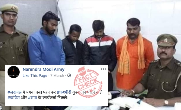 The photo of the four accused, arrested for assaulting two Kashmiri vendors in Lucknow is being shared with a false claim that they are members of the Congress and Samajwadi Party. Media reports and local police inform that the attackers only belong to a right wing group Vishwa Hindu Dal Trust.