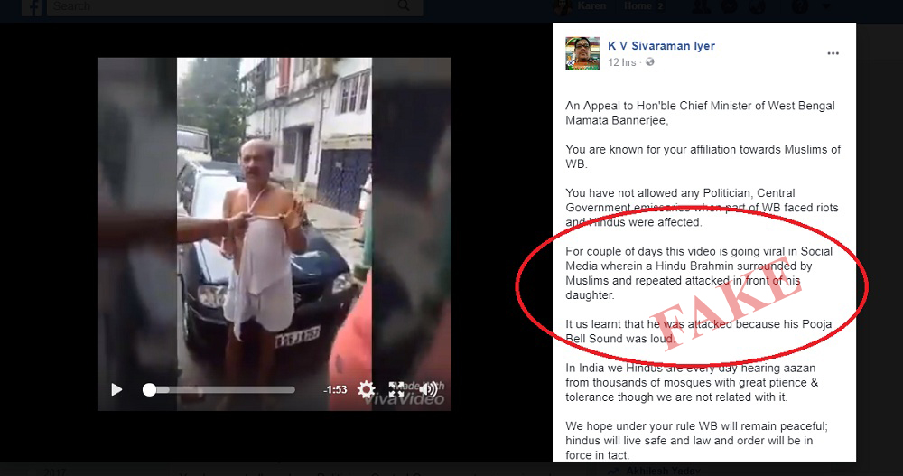 No. The video is of a local priest being thrashed by a mob in West Bengal after he was caught allegedly molesting a girl. The video has gone viral on social media with text claiming that a Hindu Brahmin was attacked in front of his daughter by a Muslim mob in West Bengal. A variation of the message falsely claims that the man was attacked as the sound of his 'puja bell' upset local Muslims. The video, which has drawn outrage on social media, has been shared on Facebook, Twitter and Whatsapp with the text that gives the incident a communal hue. Furthermore it fans harmful stereotypes about disharmony between Hindus and Muslims in the state.