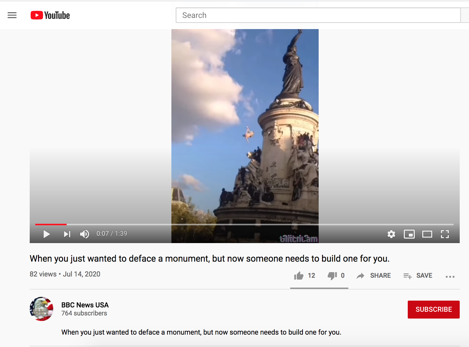 "When YOU just wanted to deface a monument, BUT now someone needs to build one for YOU," the caption of the video published on July 13, 2020 reads. It shows a man slipping from the top of a statue and falling to the ground.