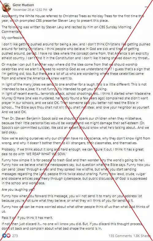 "Apparently the White House referred to Christmas Trees as Holiday Trees for the first time this year," says a November 26, 2021 Facebook post, adding that the move prompted presenter Steven Levy to issue a response on CBS Sunday Morning.