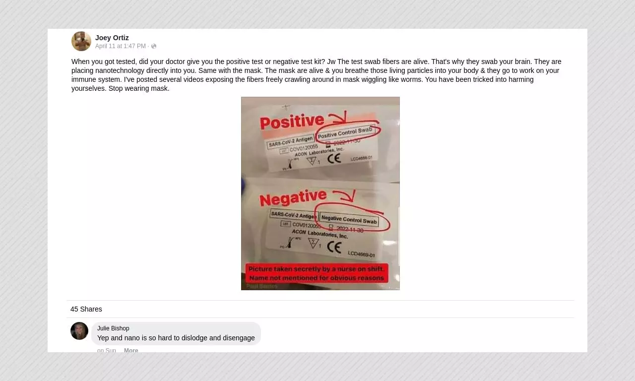 The Facebook post's caption reads: "When you got tested, did your doctor give you the positive test or negative test kit? Jw The test swab fibers are alive. That's why they swab your brain. They are placing nanotechnology directly into you.