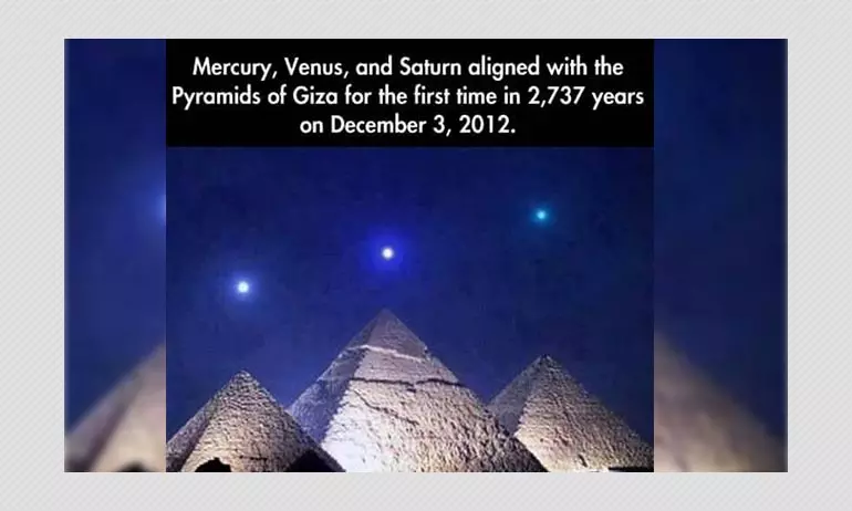 "Mercury, Venus, and Saturn aligned with the Pyramids of Giza for the first time in 2,737 years on December 3, 2012," reads the caption of a photo of the three pyramids at night, below three bright celestial objects directly above their peaks.
