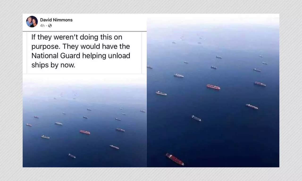 "If they weren't doing this on purpose. They would have the National Guard helping unload ships by now," says text above an aerial photo of dozens of container ships anchored off the ports of Long Beach and Los Angeles, which is featured in an October 5, 2021 Facebook post.