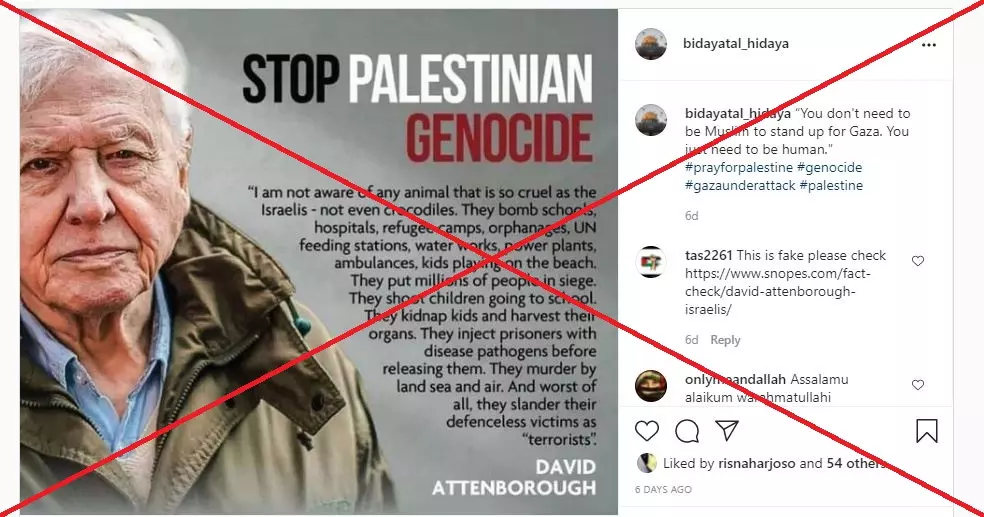 A screenshot of the misleading Instagram post as of May 26, 2021. "Stop Palestinian genocide," the title reads, alongside a photo of Attenborough.