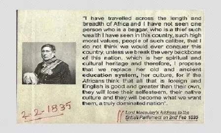 "If the Africans think that all that is foreign and English is good... they will become what we want them, a truly dominated nation," reads the extract of a speech purportedly given by Lord Macaulay to Britain's parliament on February 2, 1835.