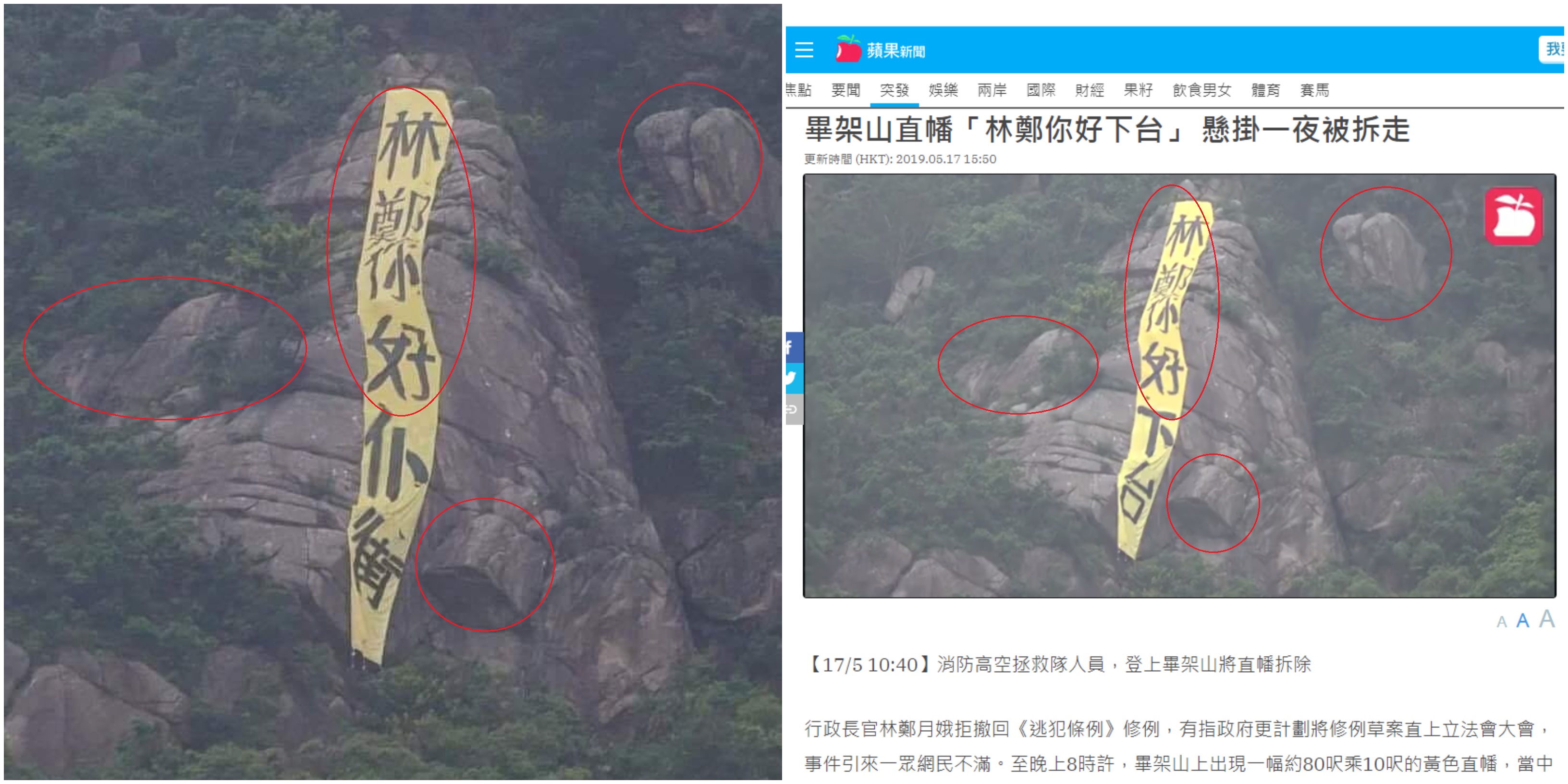 Screenshot comparison of the manipulated image (L) and the Apple Daily report (R) Photos of the original banner were also published in May 2019 here by Hong Kong media outlets Hong Kong Free Press and Stand News.
