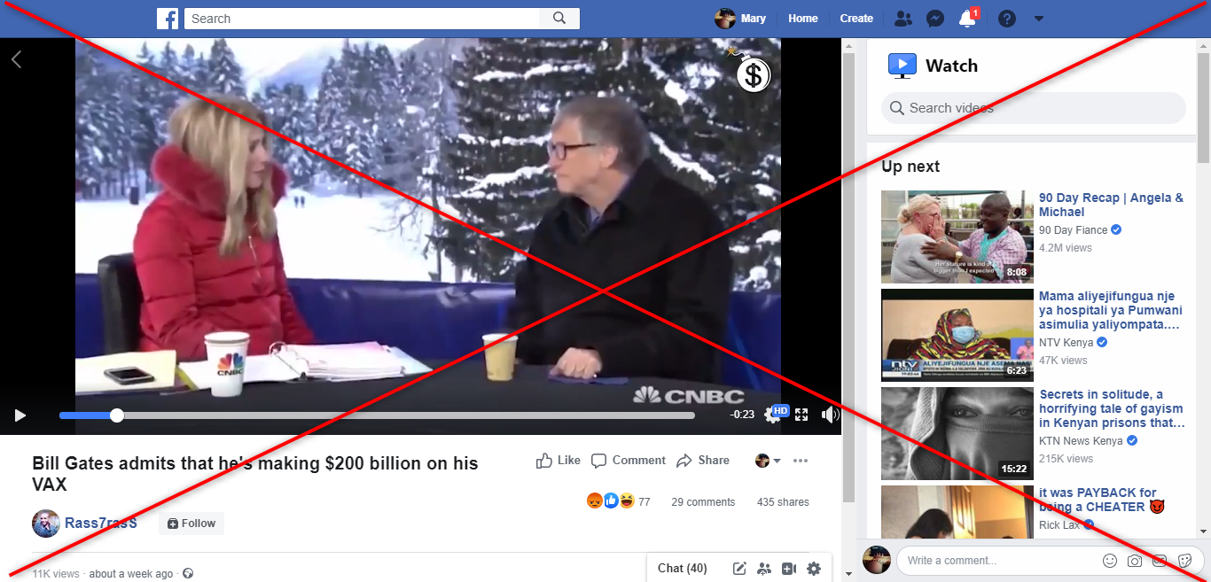 "Bill Gates admits that he's making $200 billion on his VAX (sic)," reads a Facebook post sharing the video, which we've archived here.