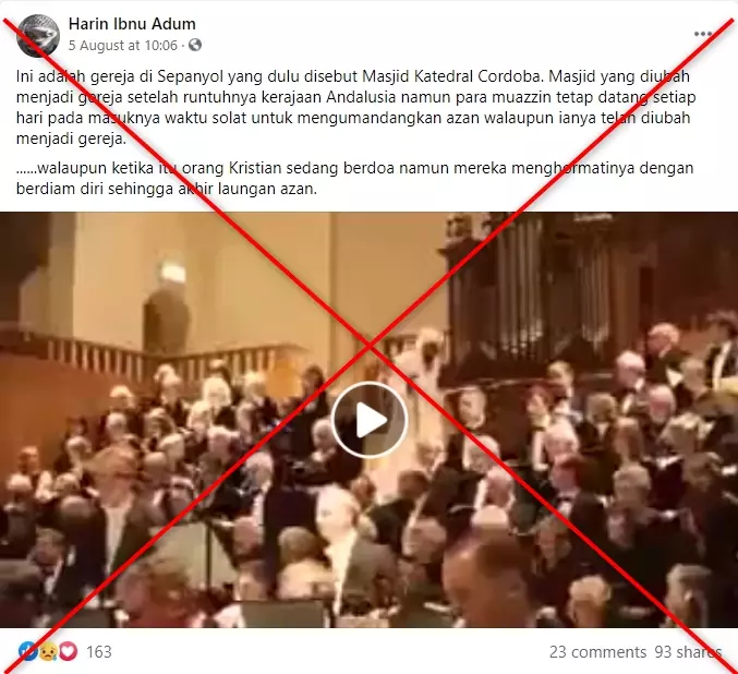The Malaysian-language caption states: "This is a church in Spain that was once called the Mosque-Cathedral of Cordoba. The mosque was converted into a church after the collapse of the Andalusian kingdom but muezzins still come every day at the beginning of the prayer time to recite the call to prayer even though it had been converted into a church.