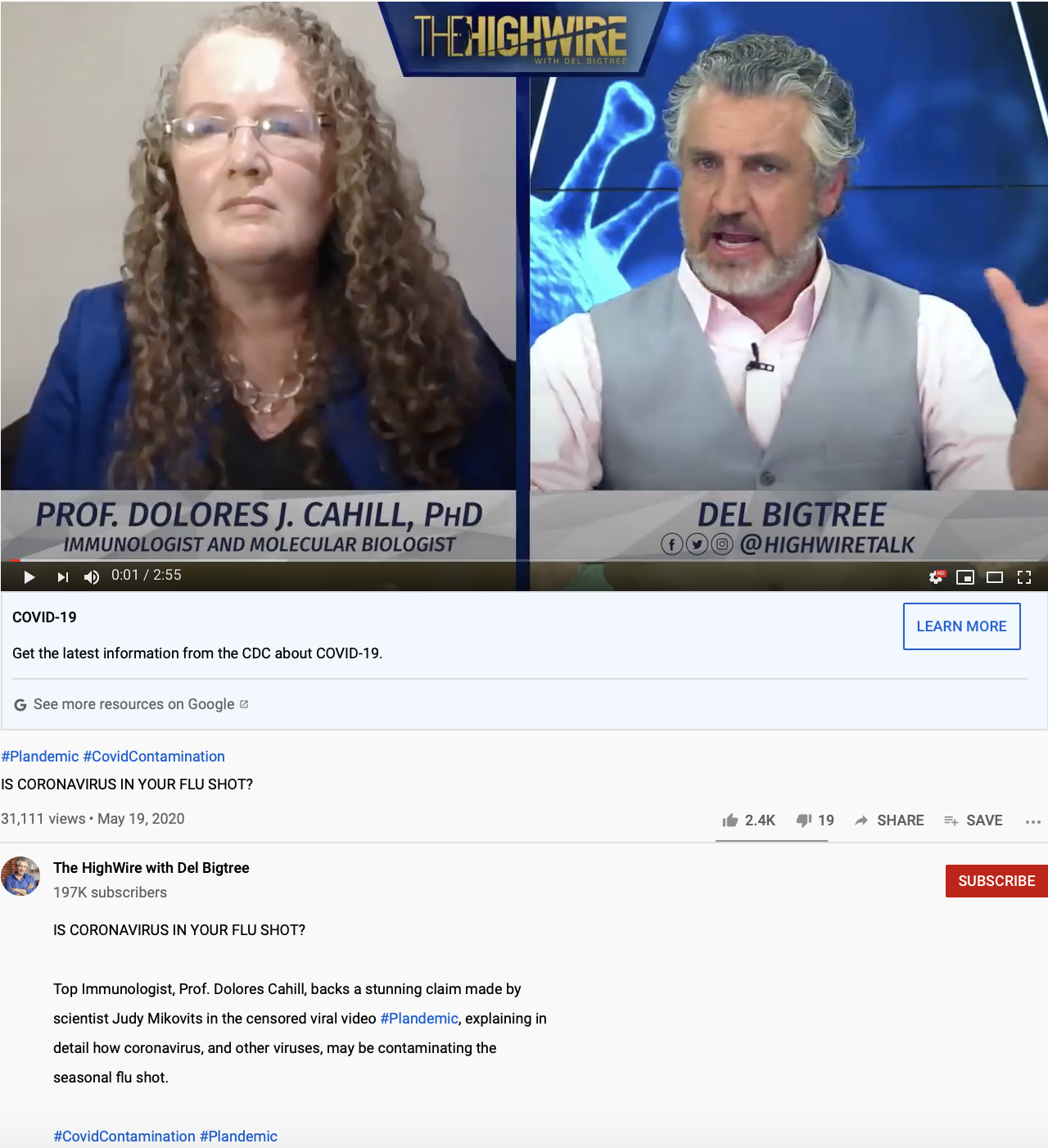 "I agree entirely with Judy… if they use a tissue to make the influenza vaccine, and that tissue comes from a dog or from a monkey, they intrinsically have coronaviruses," Dublin professor Dolores Cahill says in a YouTube video posted in May 2020.