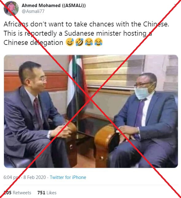 "Africans don't want to take chances with the Chinese. This is reportedly a Sudanese minister hosting a Chinese delegation," reads the caption on a tweet shared more than 200 times since February 8.