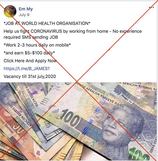 However, the claim is false. The WHO in Uganda issued a statement on its official Facebook page on June 11, 2020, warning the public "to disregard" the job advert "because it's FAKE".