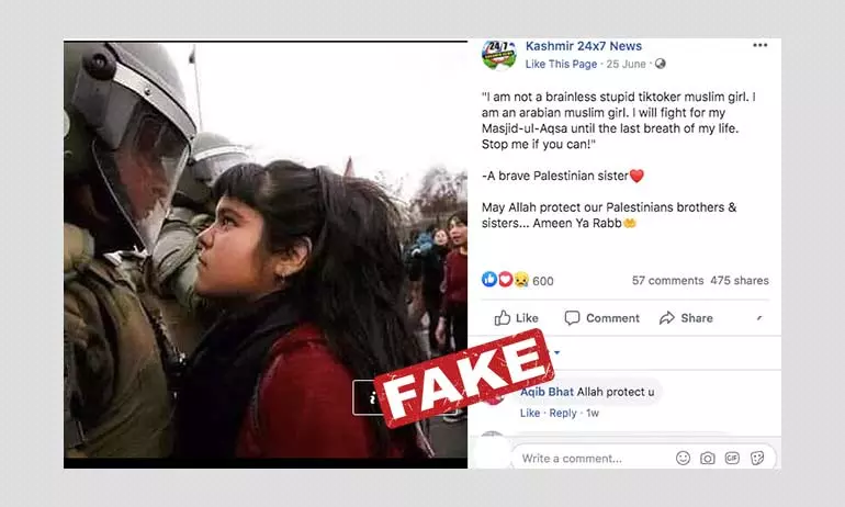 A photo of a young woman staring down a riot police officer has been shared hundreds of times in multiple Facebook and Twitter posts alongside a claim it shows a Palestinian girl protesting against Israel's occupation of the Al-Aqsa mosque, an Islamic holy site in Jerusalem. The claim is false; the photo in fact shows a political demonstration in Chile in 2016.