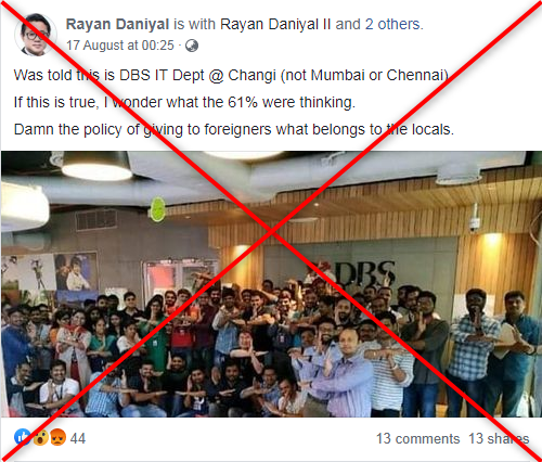 The caption says: "Was told this is DBS IT Dept @ Changi (not Mumbai or Chennai). If this is true, I wonder what the 61% were thinking. Damn the policy of giving to foreigners what belongs to the locals."